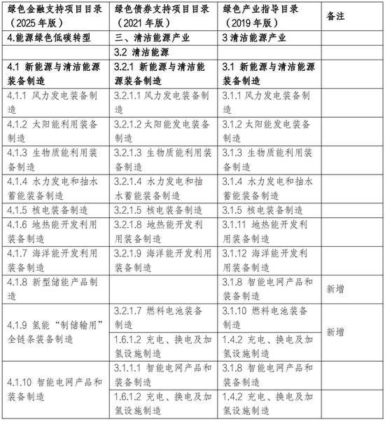 本部分“新能源与清洁能源装备制造”进行了系统性调整,在《绿债目录(2021年版)》与《绿产目录(2019年版)》的基础上,新增了“4.1.8 新型储能产品制造”和“4.1.9氢能‘制储输用’全链条装备制造”两个条目,突出了全链条发展的思路;同时对原有条目进行了内容的调整,通过整合关联领域、细化新兴方向,使分类体系更契合行业发展实际需求。